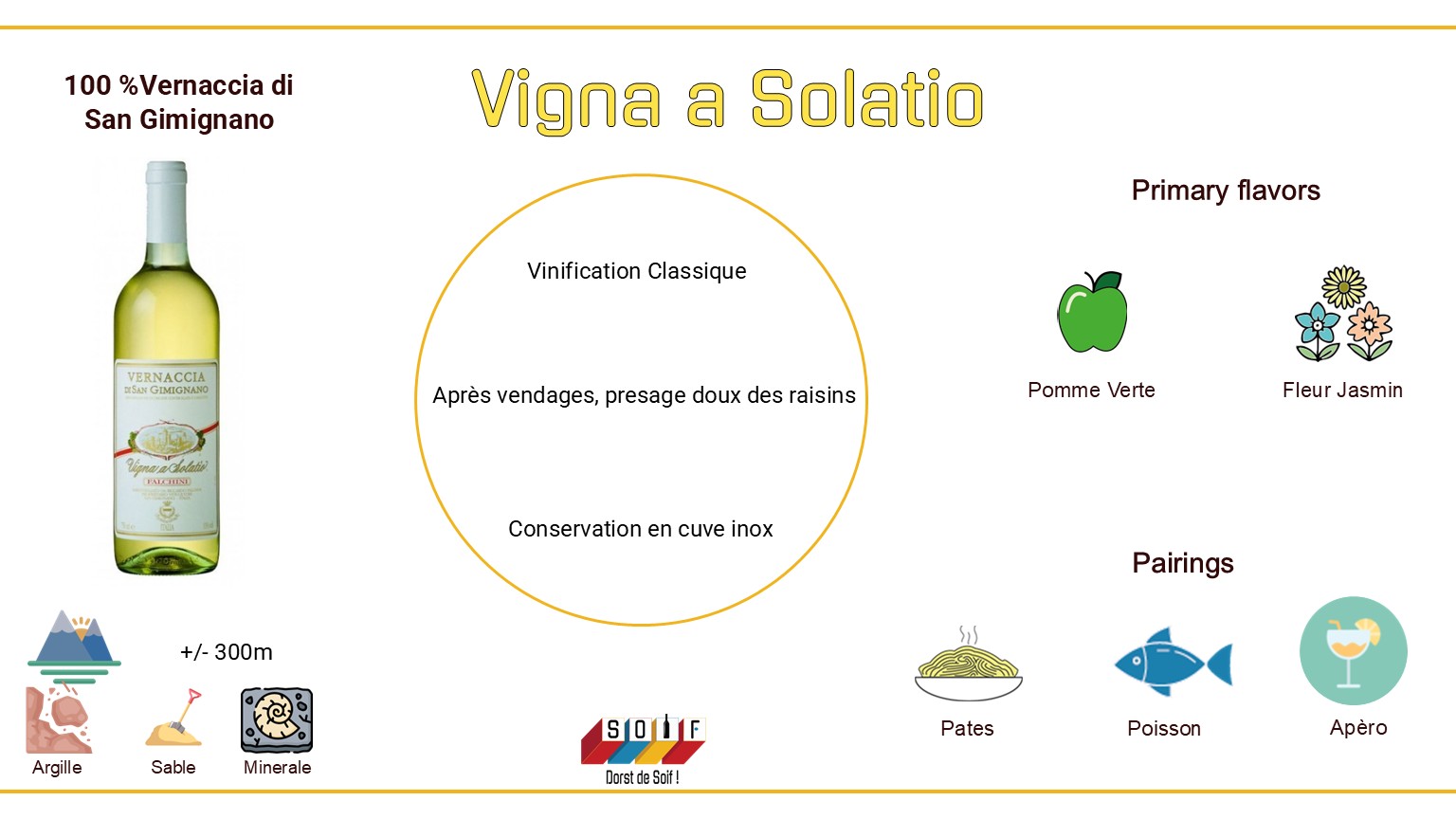 Smaakprofiel Fris en elegant. Aroma's van groene appel en jasmijn. In de mond evenwichtig en fruitig met een verfijnde, frisse afdronk.